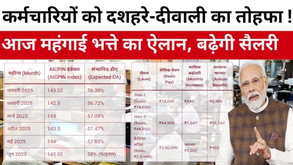 DA Hike May Be Announced Today: केंद्रीय कर्मचारियों को महंगाई भत्ते का तोहफा दशहरे और दीवाली से पहले मिलने वाला है , केंद्र सरकार के द्वारा केंदी कर्मचारियों और पेंशन भोगियों के लिए आज बुधवार 1 अक्टूबर को महंगाई भत्ते का ऐलान किया जा सकता है , मिली जानकारी के मुताबिक केंद्र सरकार इस बार महंगाई भत्ते में तीन प्रतिशत तक की बढ़ोतरी कर सकती है हालांकि महंगाई भत्ते का अनाउंसमेंट किए जाने के बाद किन कर्मचारियों की कितनी सैलरी बढ़ेगी ? इसकी जानकारी आगे आर्टिकल में दी गई है।