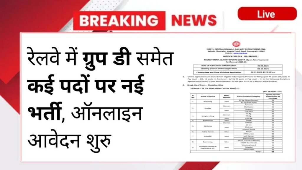 Railway Group-D New Notification 2025: अगर आप रेलवे में नौकरी की तैयारी में जुटे हुए हैं तो आप सभी के लिए शानदार मौका है नॉर्दर्न सेंट्रल रेलवे रेलवे रिक्रूटमेंट बोर्ड ने लेवल 1 लेवल 1 , लेवल 2 , लेवल 3 लेवल 4 और 5 के कुल 46 पदों के लिए आधिकारिक तौर पर नोटिफिकेशन जारी किया है।
