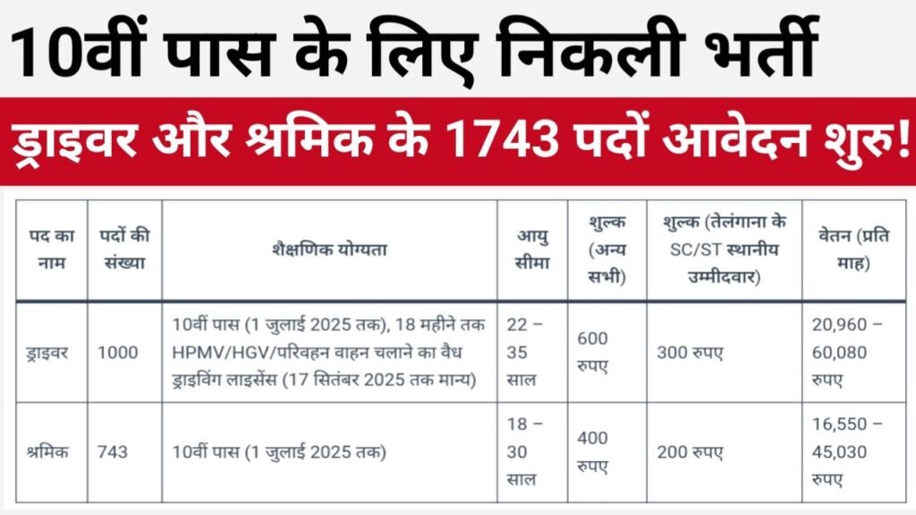श्रमिक | 743 | 10वीं पास (1 जुलाई 2025 तक) | 18 – 30 साल | 400 रुपए | 200 रुपए | 16,550 – 45,030 रुपए |